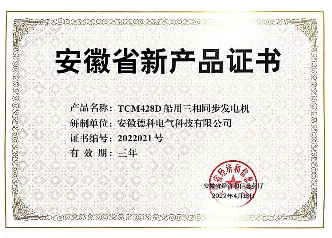 وفقا ل "التدابير المؤقتة لتحديد المنتجات الجديدة في مقاطعة آنهوي" (خطاب Wanjingxin للعلوم والتكنولوجيا رقم 120171880) ، نظمت وزارة الاقتصاد وتكنولوجيا المعلومات في مقاطعة آنهوي الدفعة الأولى من أعمال تحديد المنتجات الجديدة في مقاطعة آنهوي في عام 2022 ، وبعد التقييم من قبل الخبراء ، 113 منتجا بما في ذلك توليد الطاقة آنهوي EvoTec ، تم تحديد "TCM428D Marine Generator" كمنتجات جديدة في مقاطعة آنهوي في عام 2022.